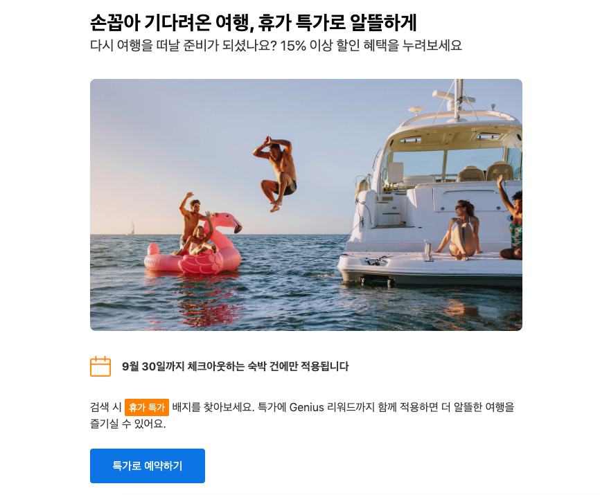 15% 할인 휴가특가 부킹닷컴 특가 프라이빗 호텔 숙박시설 확인하기