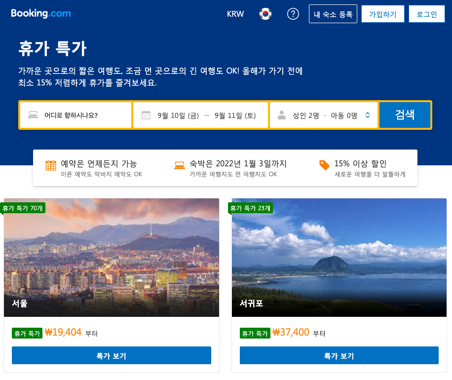 15% 할인 추석연휴 휴가특가 부킹닷컴 특가 프라이빗 호텔 숙박시설 확인하기