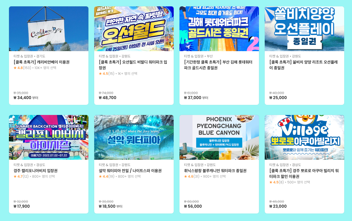캐리비안베이, 오션월드, 김해 롯데워터파크, 쏠비치양양 오션플레이, 캘리포니아비치, 설악워터파야 등등