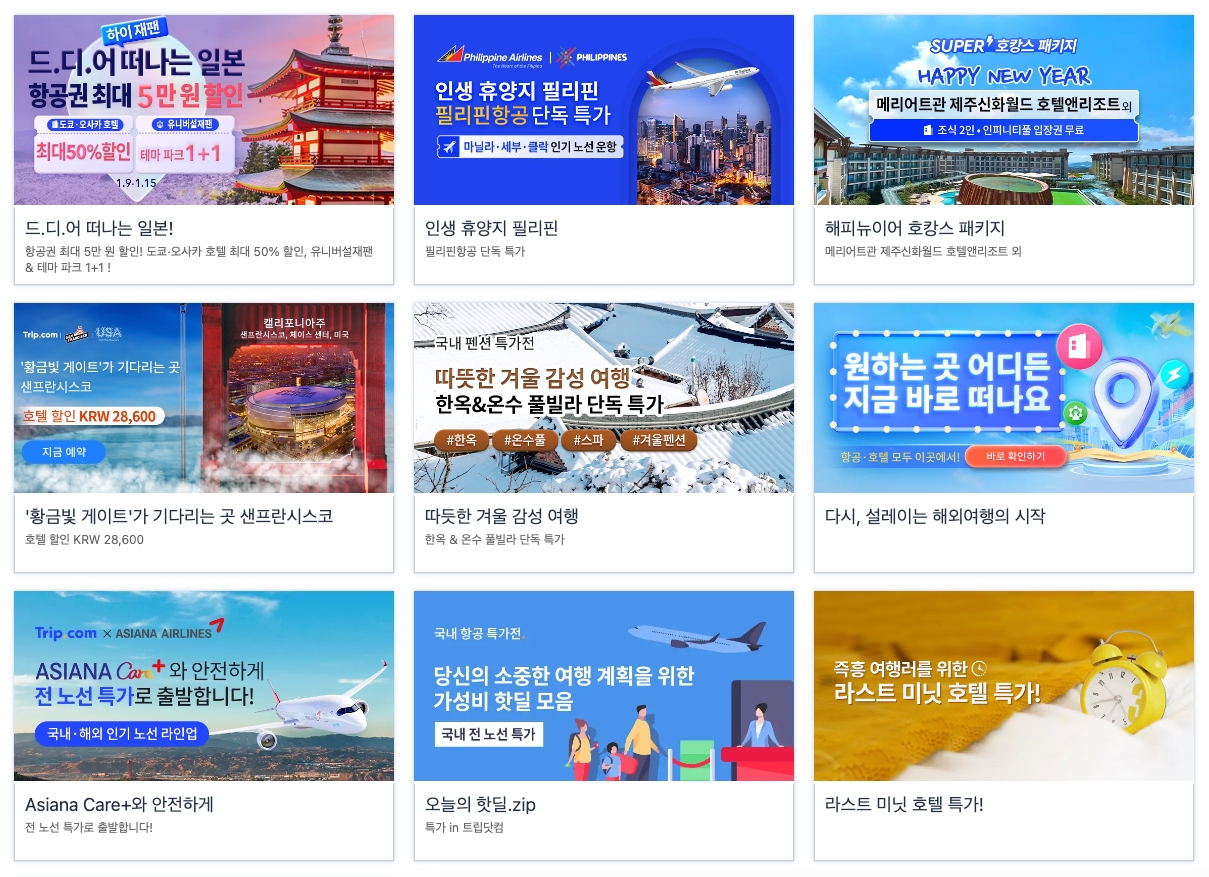 Trip.com 해외여행 및 국내 겨울시즌 호텔예약, 오사카, 다낭, 유럽 특가예약 1월 2월 커플여행 국내 축제 호텔예약 (국내호텔 기획전 / 다시 해외여행 및 국내 일출 해돋이 호캉스 / 겨울방학시즌)