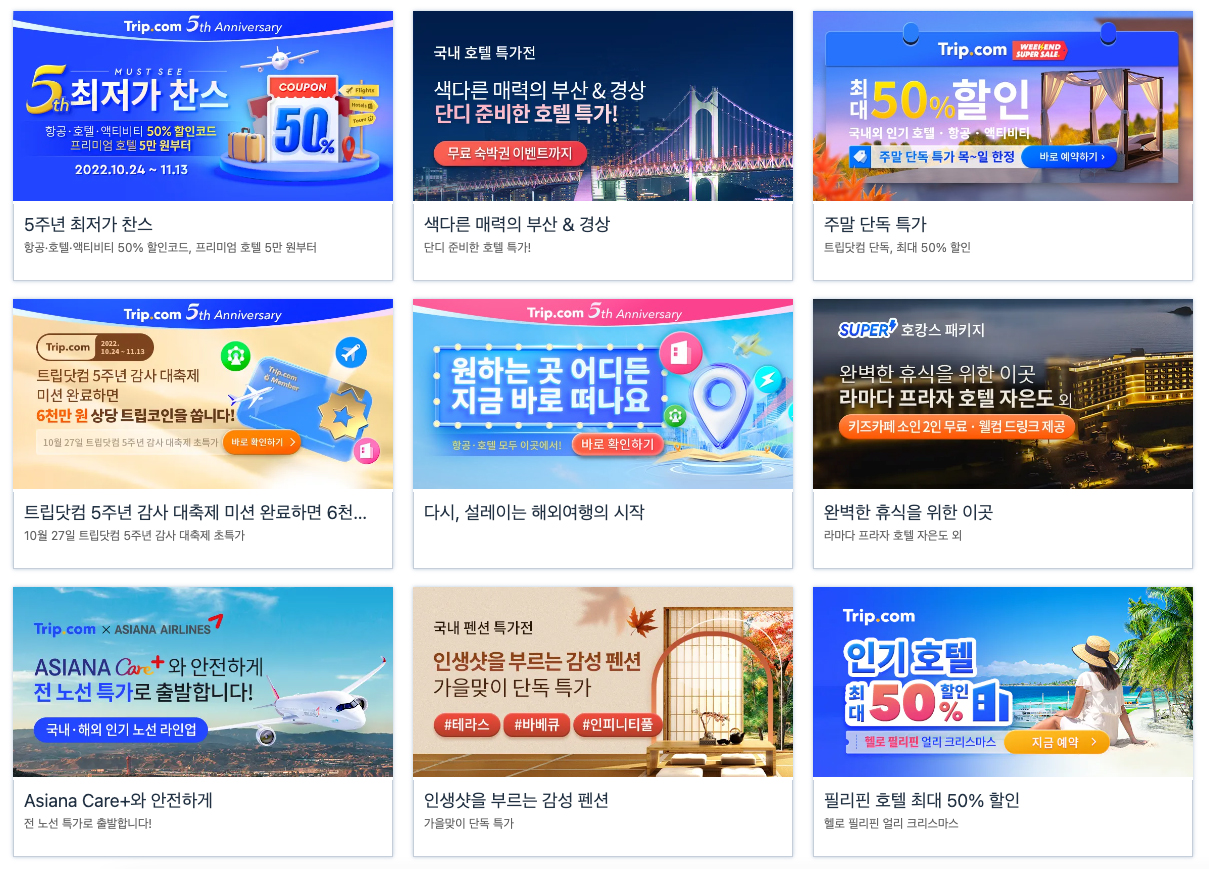 Trip.com 해외여행 및 국내 서울주요 대학교주변 호텔예약, 일본 오사카, 베트남 다낭, 유럽 특가예약 11월 12월 커플여행 국내호텔예약 (국내호텔 기획전 / 다시 해외여행 및 국내 수능시즌과 월드컵시즌 대한민국 외쳐보자!!