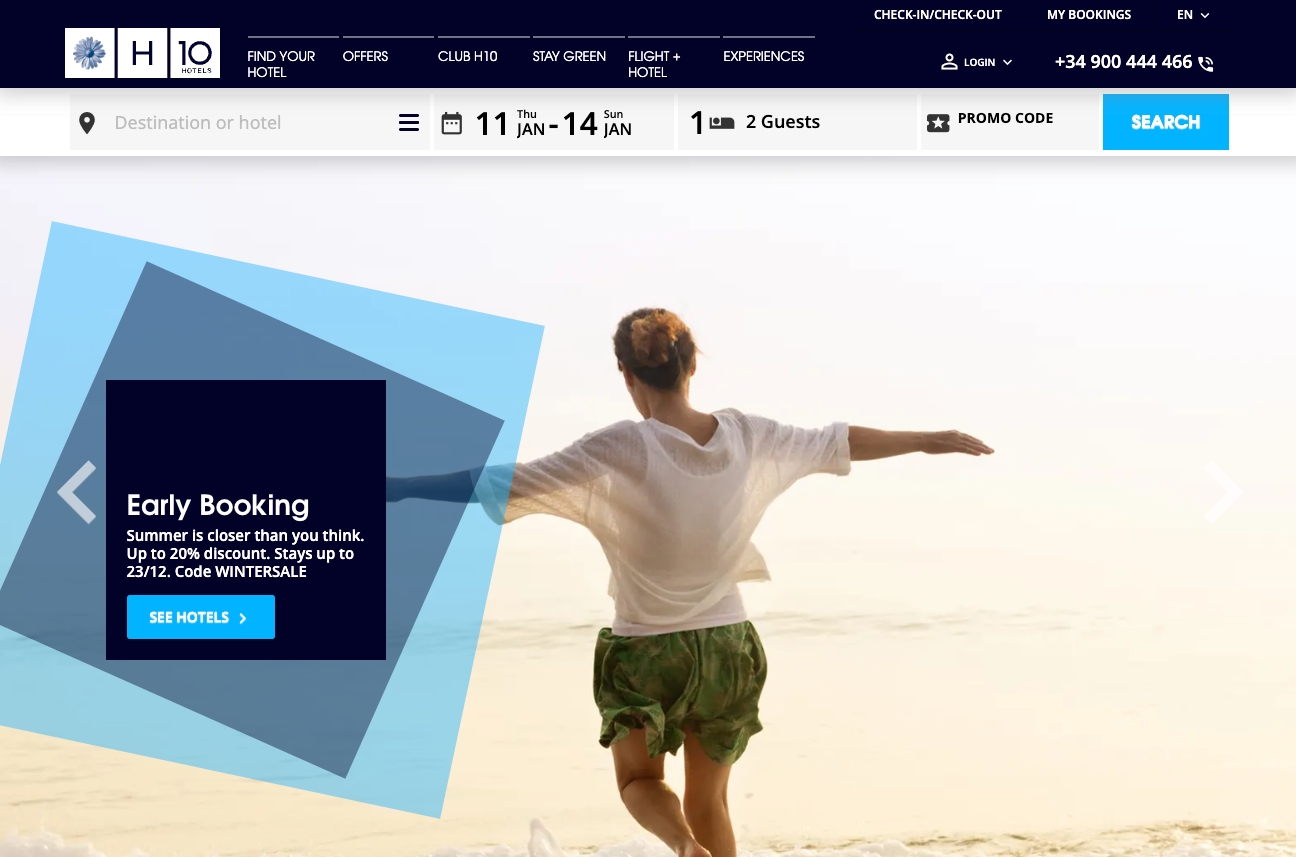 H10 Hotels discount of up to 20% off Spain Europe, Caribbean